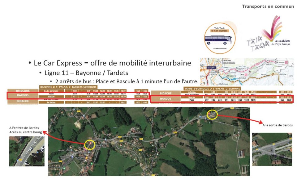 Elkartean kidetuz, 48 oren lehenago eskaera eginez gero, zuen bila etxera etortzen gara, asteazken goizean, Peyrehorade-ko merkatura joateko (8:00-12:00), 9 lekuko minibusez, eta astearte eta ostegunetan, Bidaxunealdean ibiltzeko (8:30-12:00, 14:00-18:00) SUV gisako ibilgailu arinez.